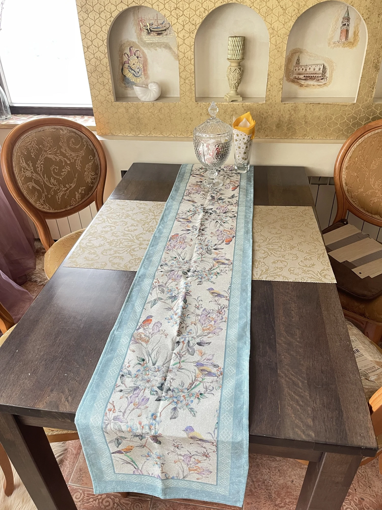 The EMESA HOME Blue Birds & Flowers Linen Table Runner adds a charming touch to any occasion. Made from 100% high-quality linen, this table runner features a beautifully printed plant pattern, perfect for weddings, home dining, or party décor. Its fine craftsmanship and durable fabric ensure a long-lasting, stylish addition to your kitchen or dining table. The single-layer finish provides a high-density weave that is firm and washable, offering both elegance and practicality.